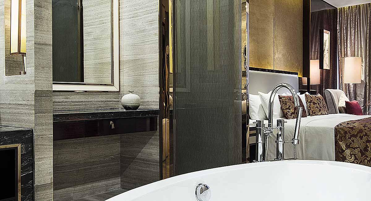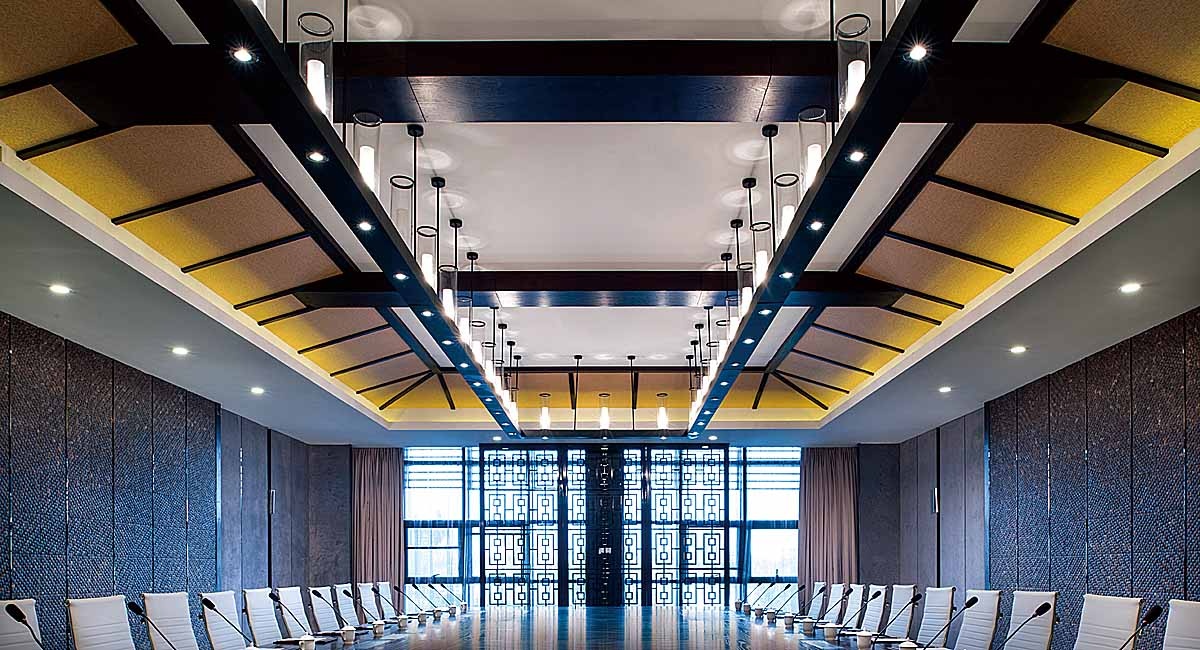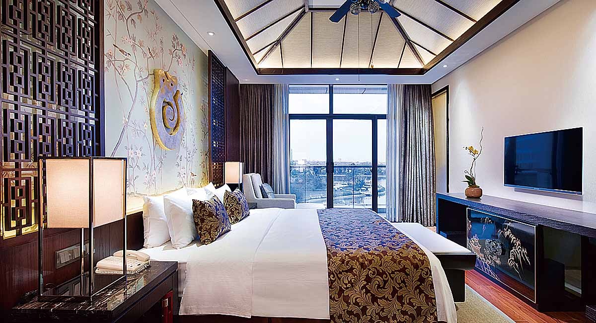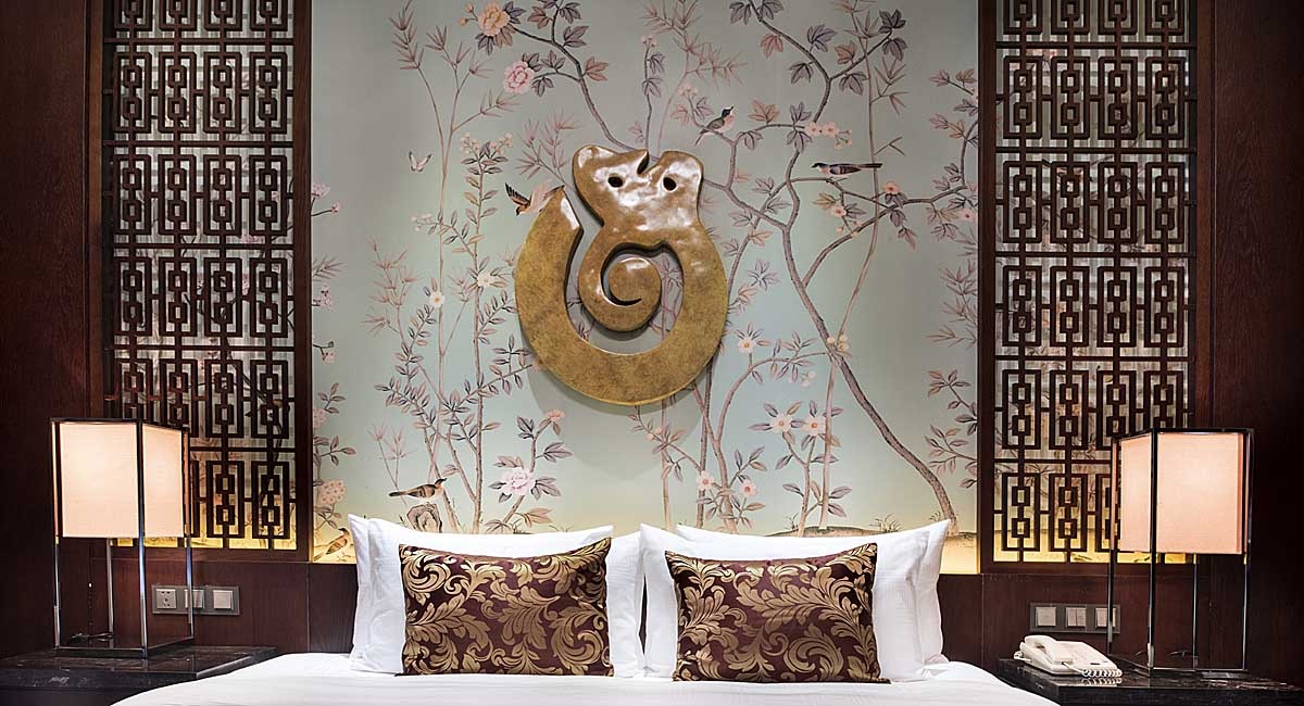 藍溪度假大酒店以中國傳統文化“福”文化展開,以此來呼應酒店外圍環境的“壽字湖”,以“壽”字提煉的金屬花格用于床頭背景,頗具中式意境,色彩則以壽比南山取之于“青”,福如東海取之于“藍”做為空間色,與溫馨沉穩的木色和墻紙形成一定的統一和變化,將天花處理成四坡頂天花,大大提升了空間高度的視覺印象,層次變得豐富多彩,耐人尋味。