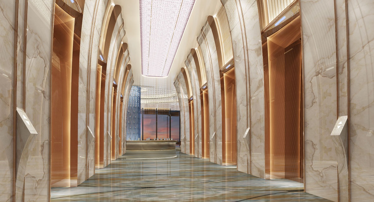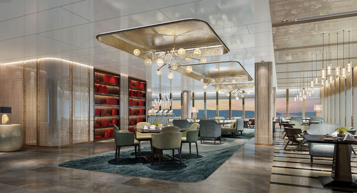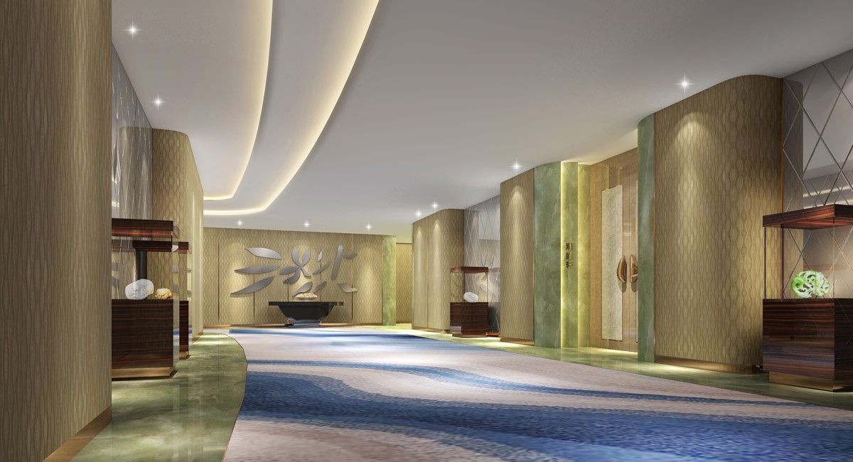 設計理念:參照項目方的設計要求,結合酒店所處的地域和建筑外觀形態的個性,我們提出了一石、一浪、一船,三個設計元素。將自然界的無形以有形的設計手法,貫穿于整個酒店的設計之中。令酒店像金石一樣歷久彌新,亦象征這酒店百舸爭流、乘風破浪、永攀新高的美好寓意。
